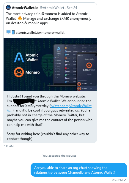 <xmrhaelan> They contacted me asking if I knew how to reach the admin of @monero on Twitter...